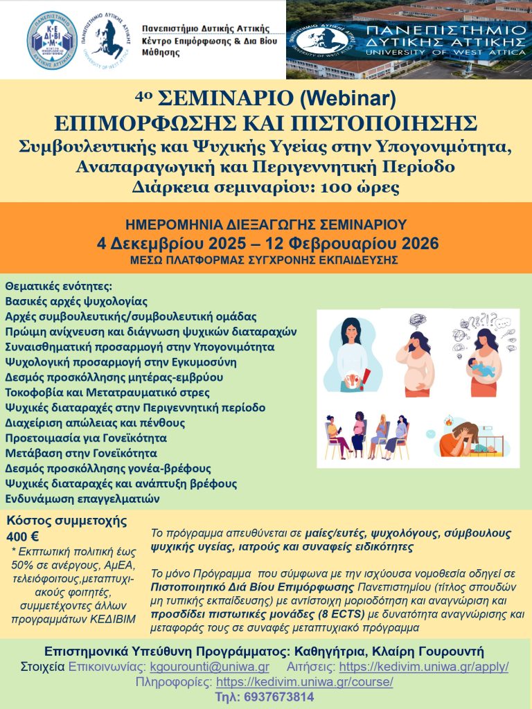 Το πρόγραμμα στοχεύει στην εκπαίδευση και επιμόρφωση των συμμετεχόντων σε θέματα Συμβουλευτικής στο αντικείμενο της περιγεννητικής και αναπαραγωγικής ψυχικής υγείας. Ο σκοπός του προγράμματος είναι να επιμορφώσει και να εκπαιδεύσει τους συμμετέχοντες δίνοντας τους τη δυνατότητα να παρέχουν υπηρεσίες συμβουλευτικής και ψυχολογικής υποστήριξης σε γυναίκες αναπαραγωγικής και περιγεννητικής περιόδου που αντιμετωπίζουν συναισθηματικές διαταραχές, ιδιαίτερα κατά την περίοδο που διανύουμε (περίοδος πανδημίας COVID) όπου τα ποσοστά κατάθλιψης και αγχώδους διαταραχής έχουν αυξηθεί ιδιαίτερα σε αυτές τις ευαίσθητες και ευάλωτες πληθυσμιακές ομάδες. Στην Ελλάδα, τα ποσοστά καταθλιπτικής συμπωματολογίας και αγχώδους διαταραχής κατά την αναπαραγωγική περίοδο είναι αρκετά υψηλά και κατά την περιγεννητική περίοδο αγγίζουν το 30% -40% των γυναικών. Τα ανωτέρω κάνουν επιτακτική την ανάγκη της συνεχούς και δια βίου εκπαίδευσης πάνω στο συγκεκριμένο αντικείμενο.